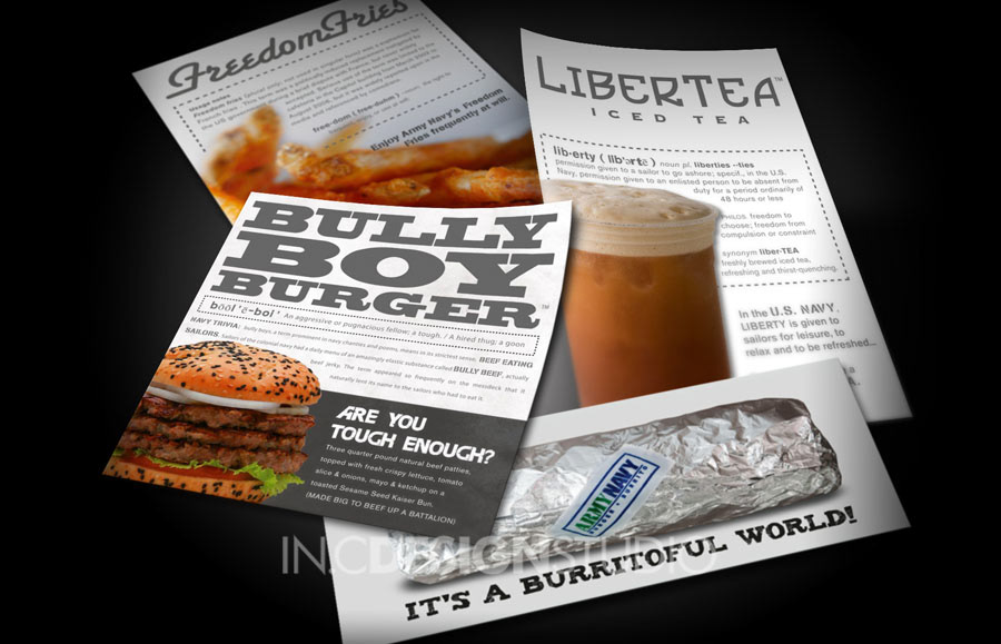 Logo and branding design and printing (supplier since 2009) for Army Navy, a fast food chain specializing in burgers and burritos..