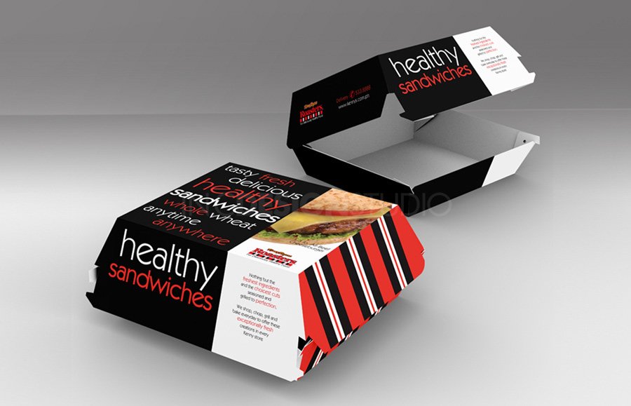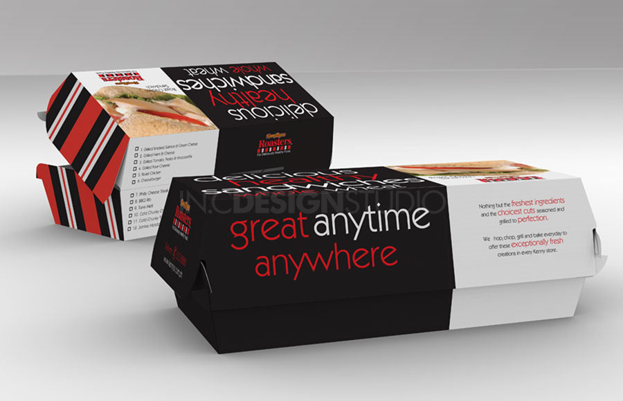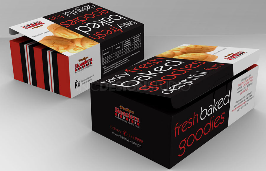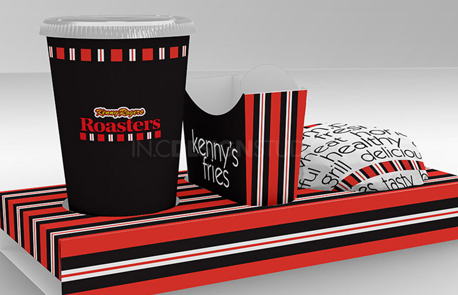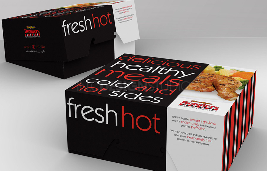 Design and Layout of the take out packaging for Kenny Rogers Roasters, a chain of chicken restaurants specializing in grilled or roasted chicken.