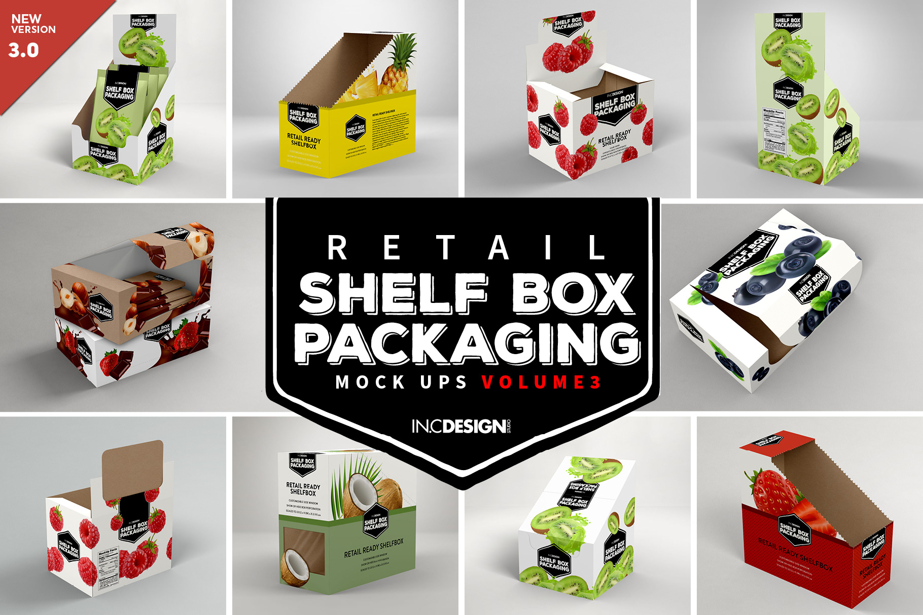 Nine (9) High Resolution Mock ups and 3 Shelf Retail Ready Box packaging in various shapes and sizes -- perfect for presentations or showcasing your design work