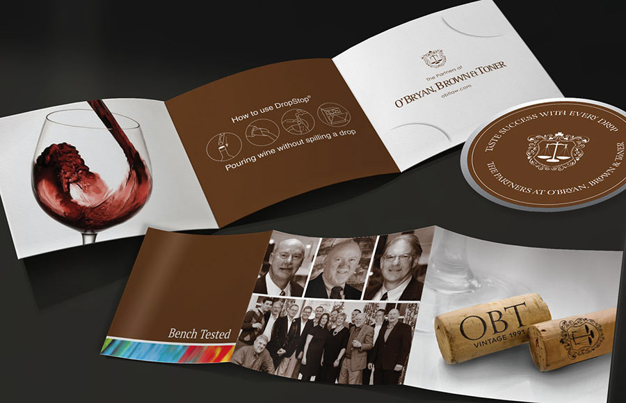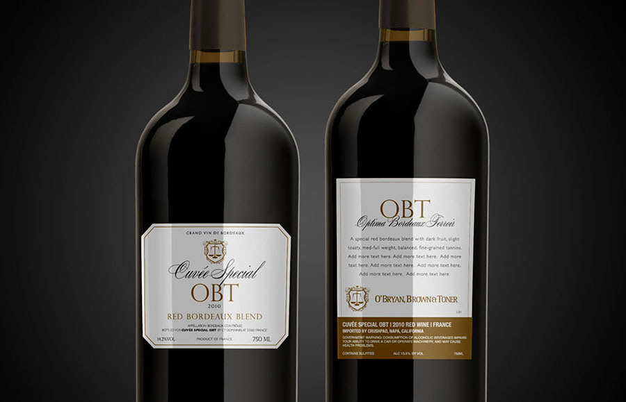 Bottle Label design, 20th Anniversary Crest Logo and Drop stopper packaging for a special Bordeaux created for O'Bryan, Toner and Brown law firm based in Louisville, KY.