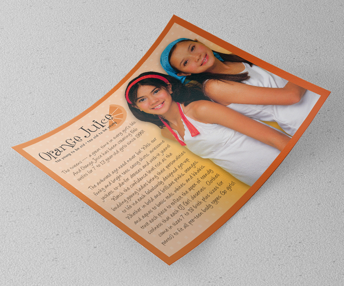 Retail store for tween girls. JOB DESCRIPTION: logo design, packaging design, hang tags, labels, flyers, posters, juice news magazine layout, all advertising material from 2002-2010